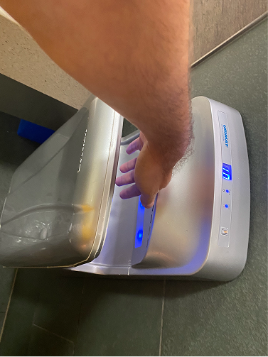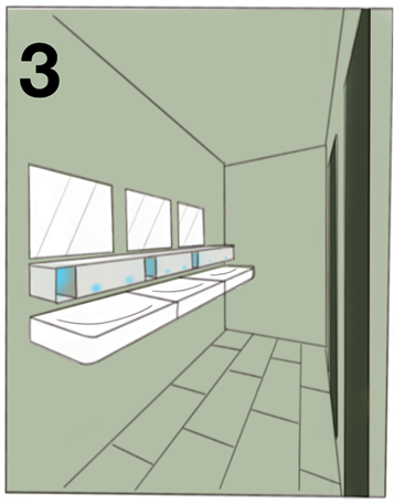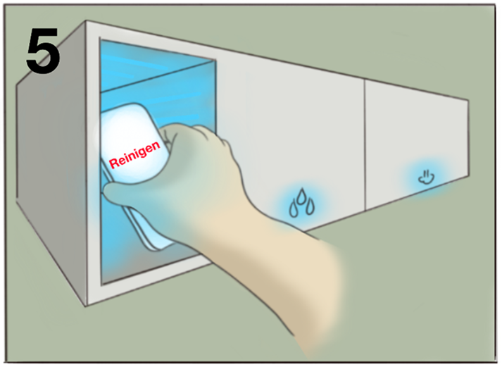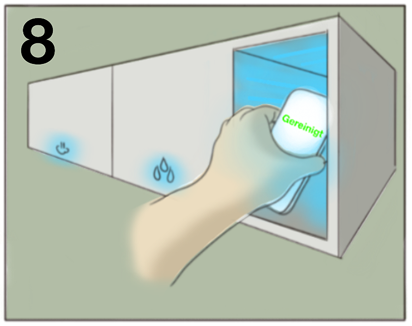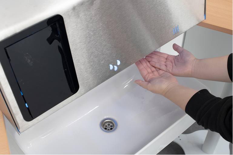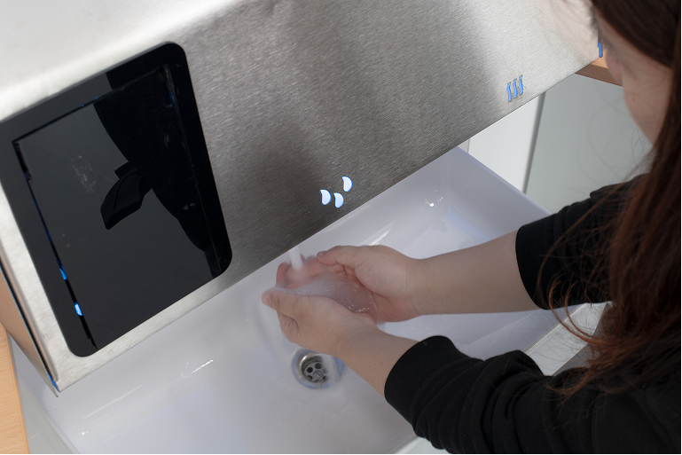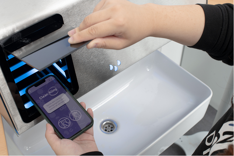 - Eine Smartphone-Reinigungsbox mit UV-Licht, integriert in das Waschbecken und den Handtrockner zur Händereinigung.