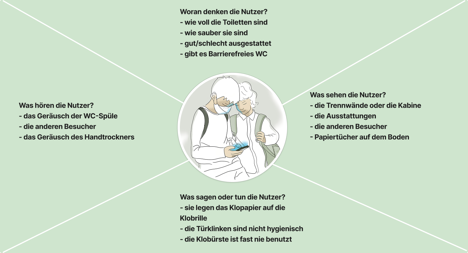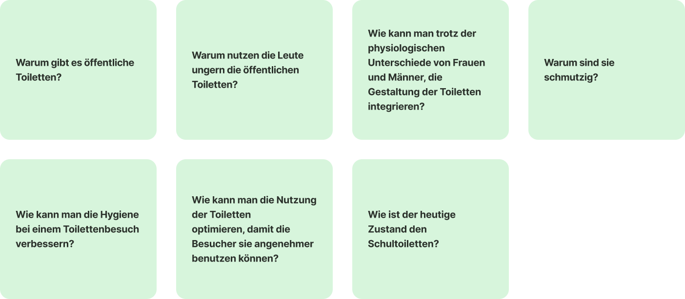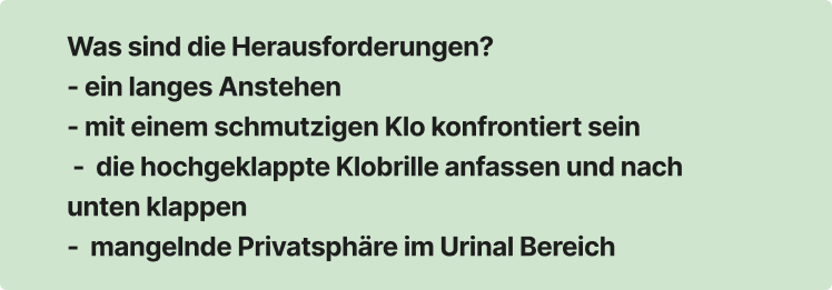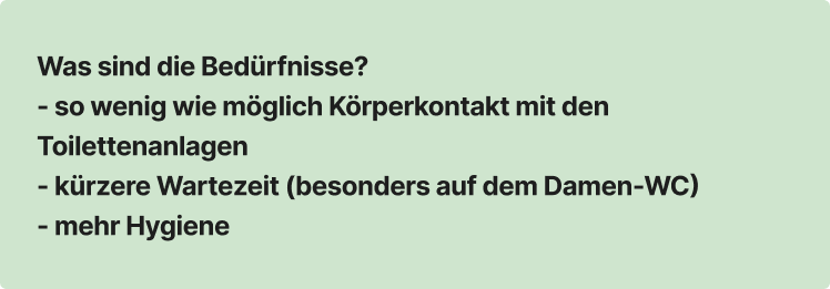 - Fehlende Transparenz über freie/defekte Toiletten sorgt für Wartezeiten und Chaos.