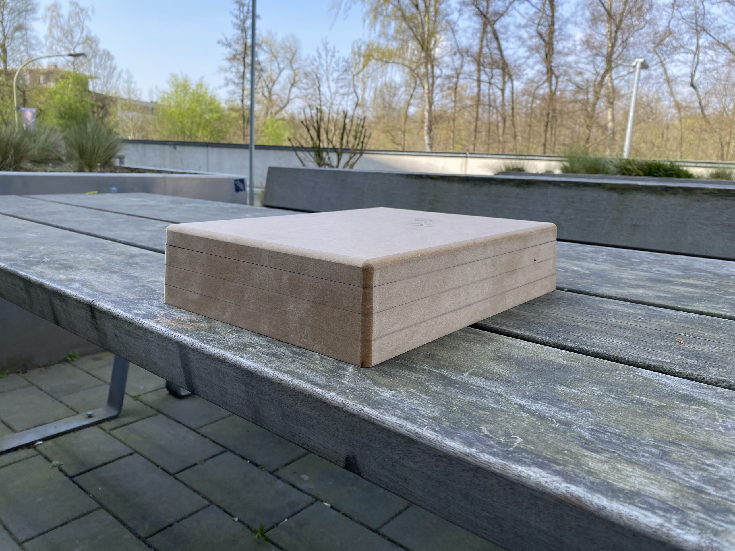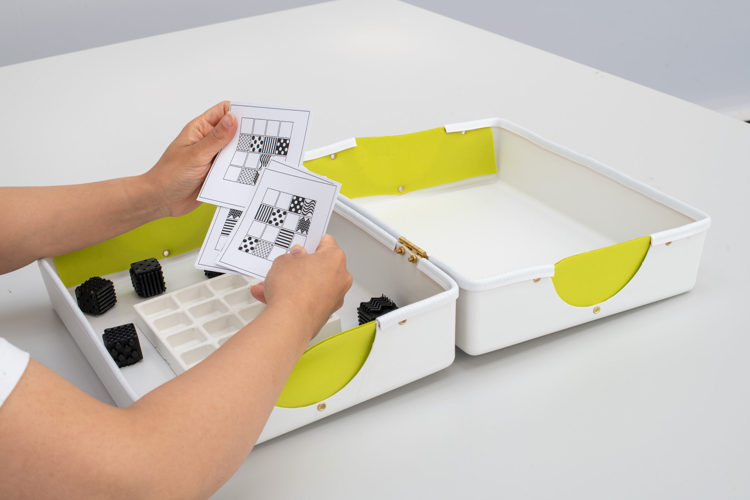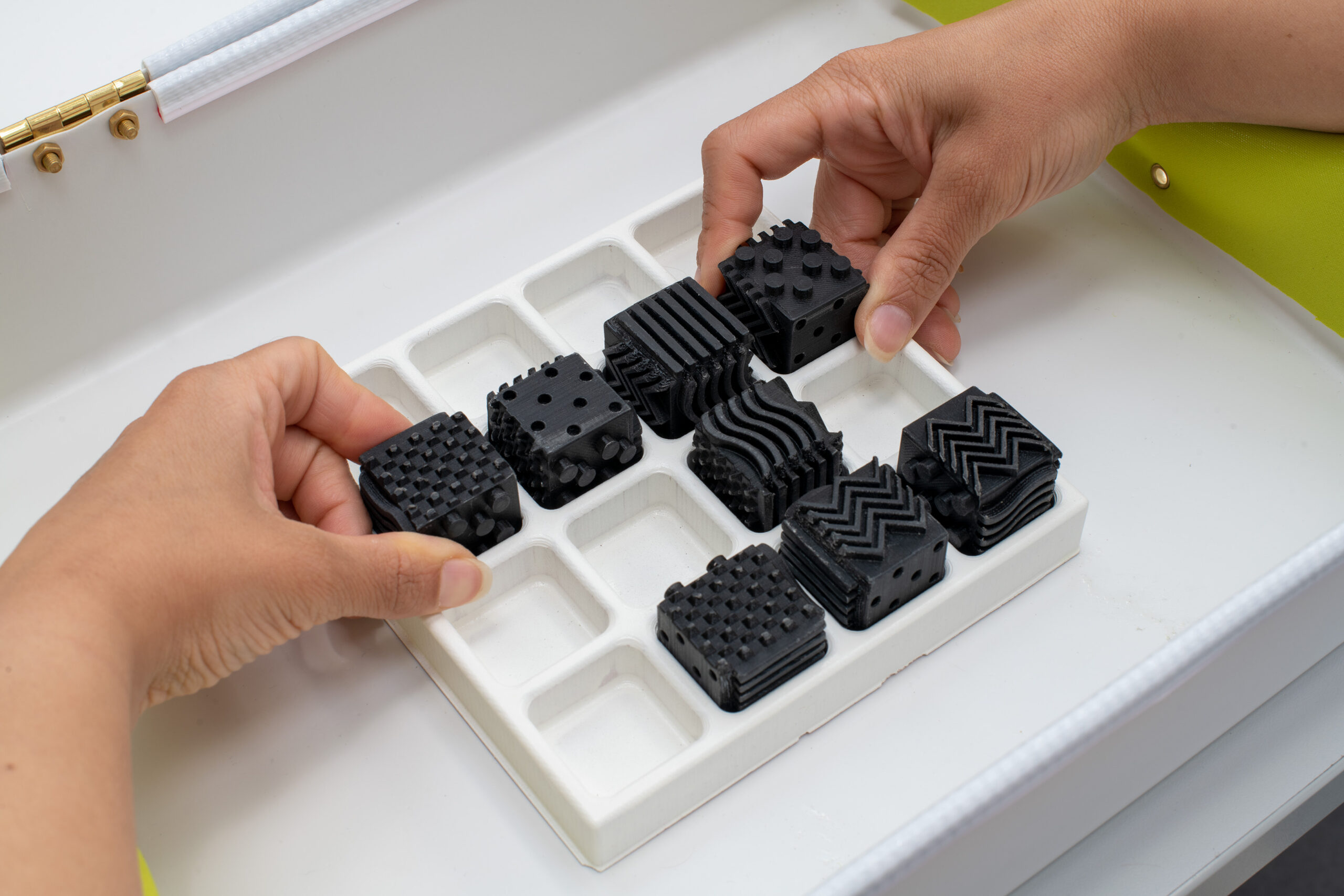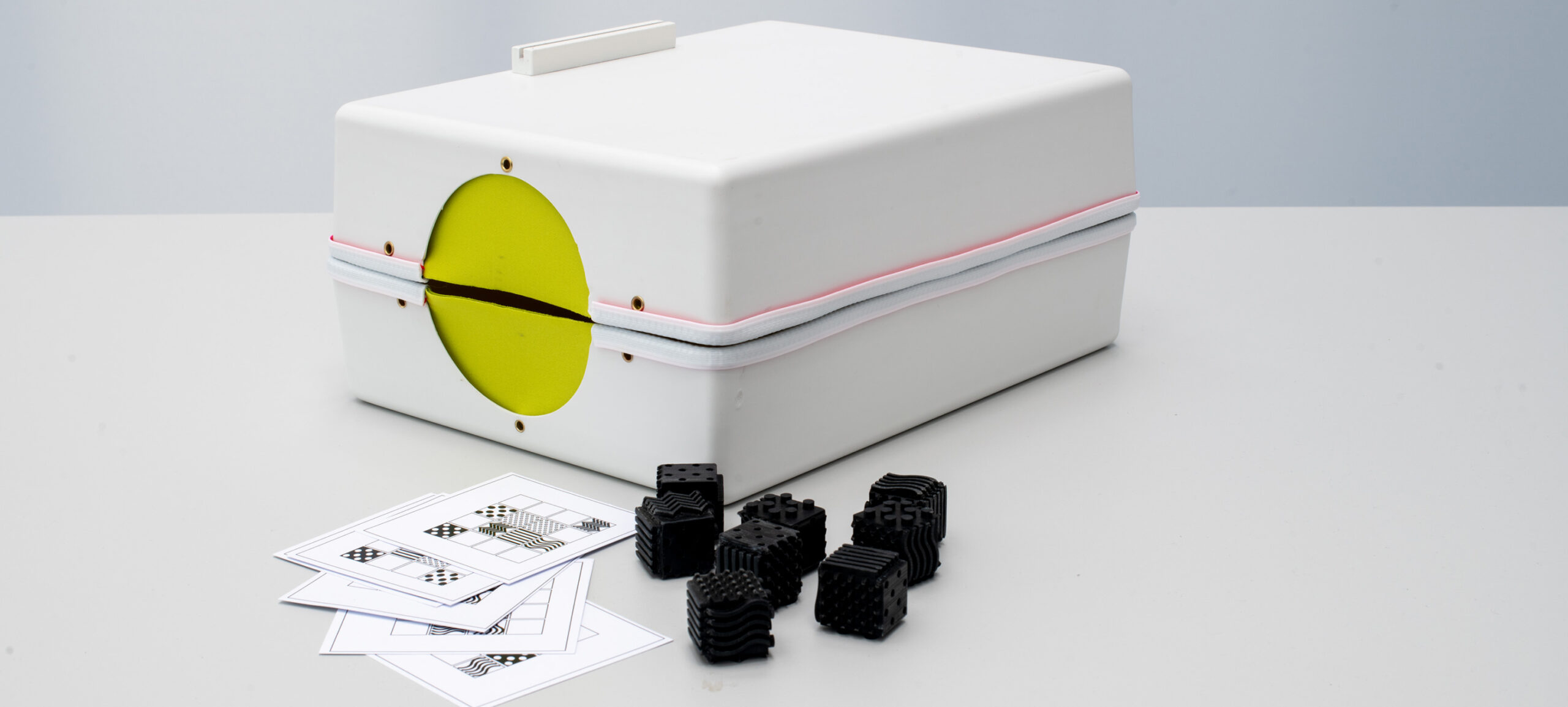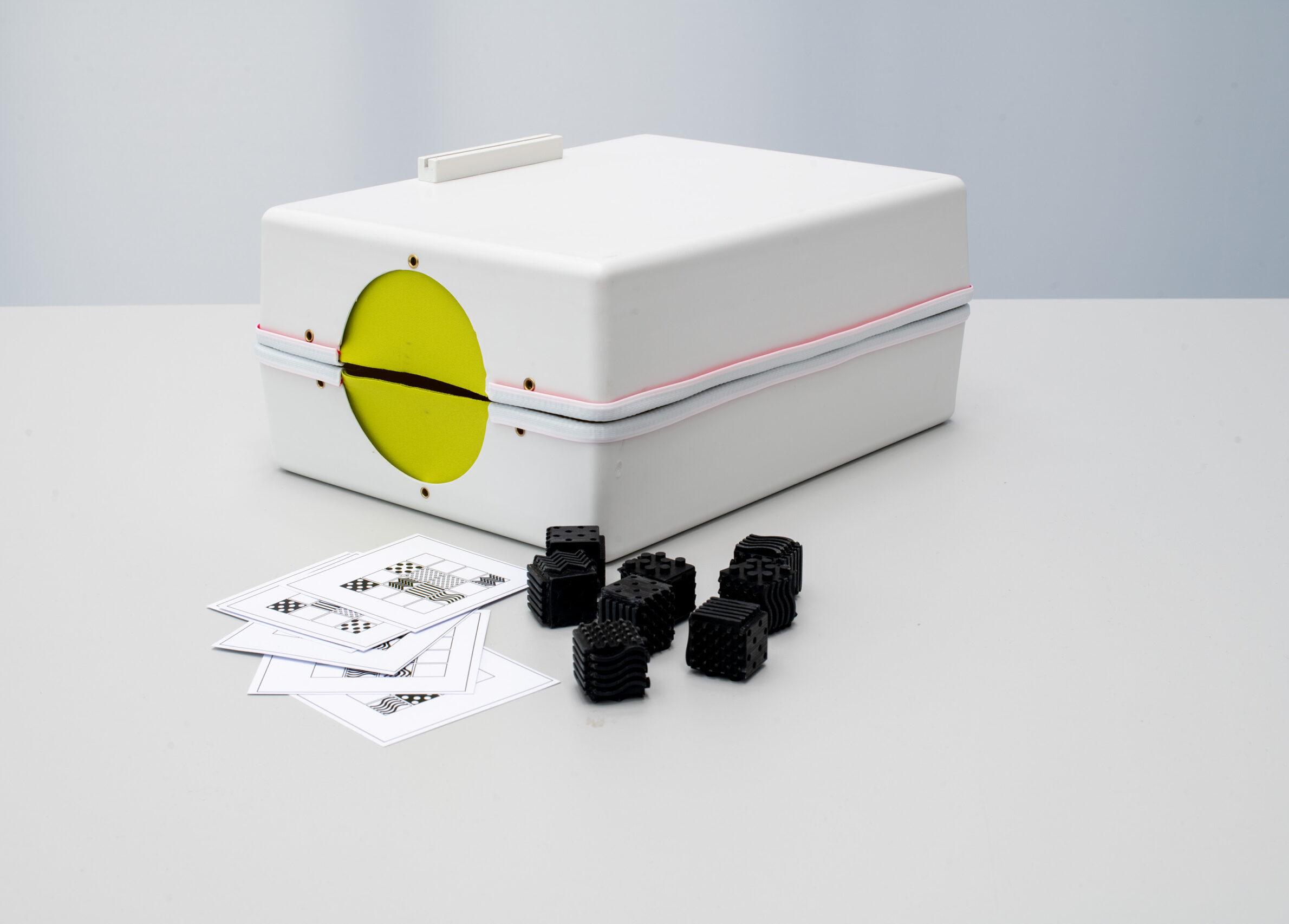 In Zusammenarbeit mit der Freddy Fischer Stiftung entwickelte ich ein Produkt, das hilft, zur Ruhe zu kommen und den Moment bewusster zu erleben. Das Ergebnis ist ein 3D-Puzzle in einer Box, dessen Teile mit unterschiedlichen Oberflächenstrukturen versehen sind. Sie werden ausschließlich über den Tastsinn angeordnet ohne in die Box hineinzusehen.